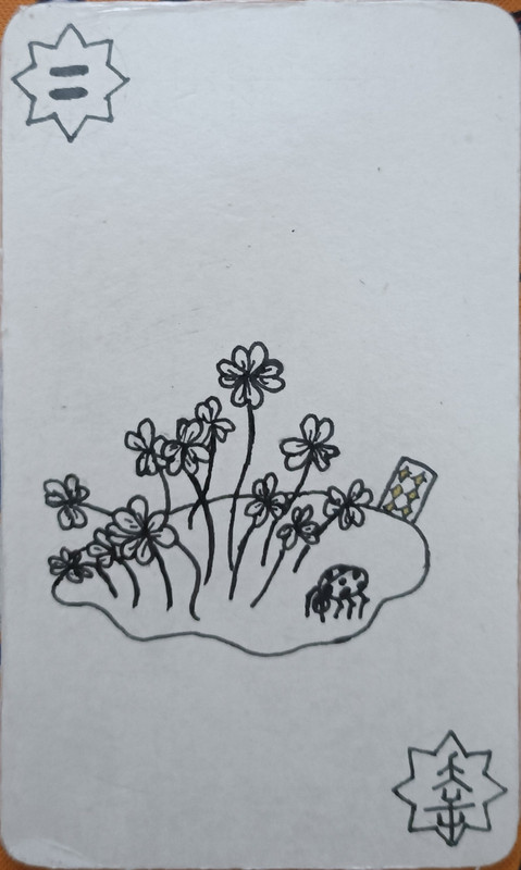 就是那个四叶草,这是一个代表好运的牌,一个意想不到的惊喜,喜出望外的好消息,用的就是四叶草的花语。 延伸,运气好就喜欢干一些冒险的事,投机取巧(比如赌博).当然,雷诺曼也有根据画面和本身形象的含义沿伸,比如,四叶草是一种很小的草,所以这个好运,并不是那种走大运十年八载的那种,而是短时间的,短暂的快乐;而且,四叶草是很小一株,贴地生长的,所以,在寻物的时候,可以借助这个部分的特点来进行拓展延伸。